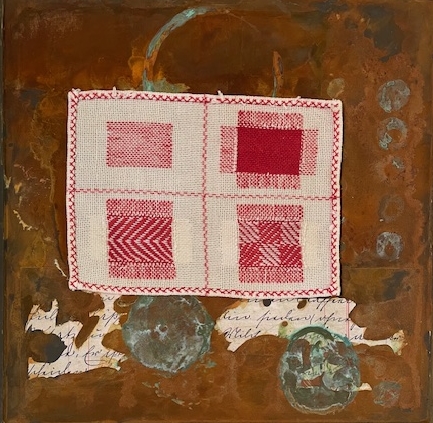 Altes Mustertuch aus Graubünden mit Rost und Patina, 30 x 30