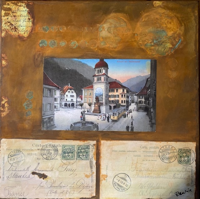 Altdorf - Telldenkmal II mit ehemaligem Wohnhaus von Berti Jütz, Collage, Rost und Patina 50 x 50
