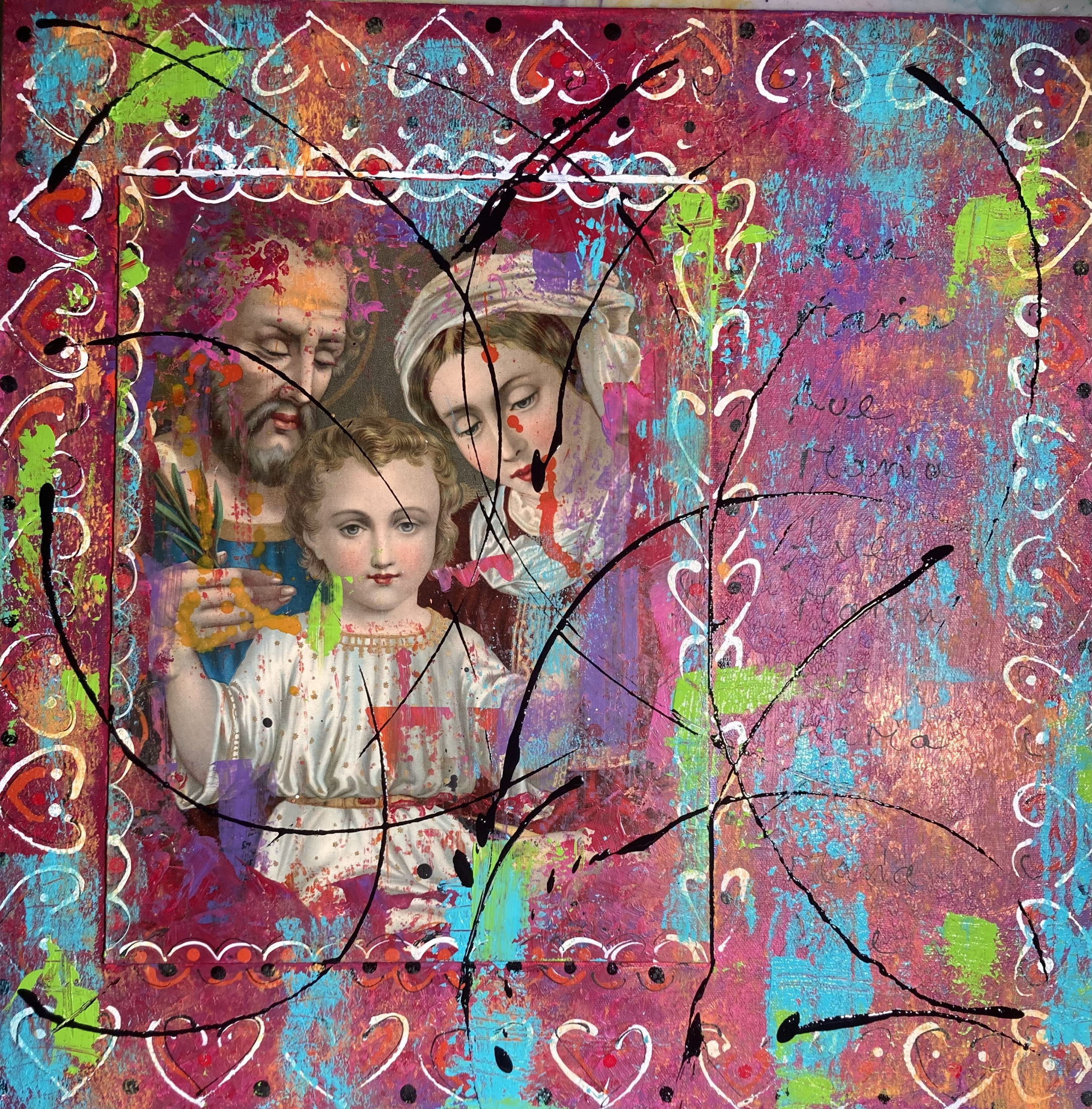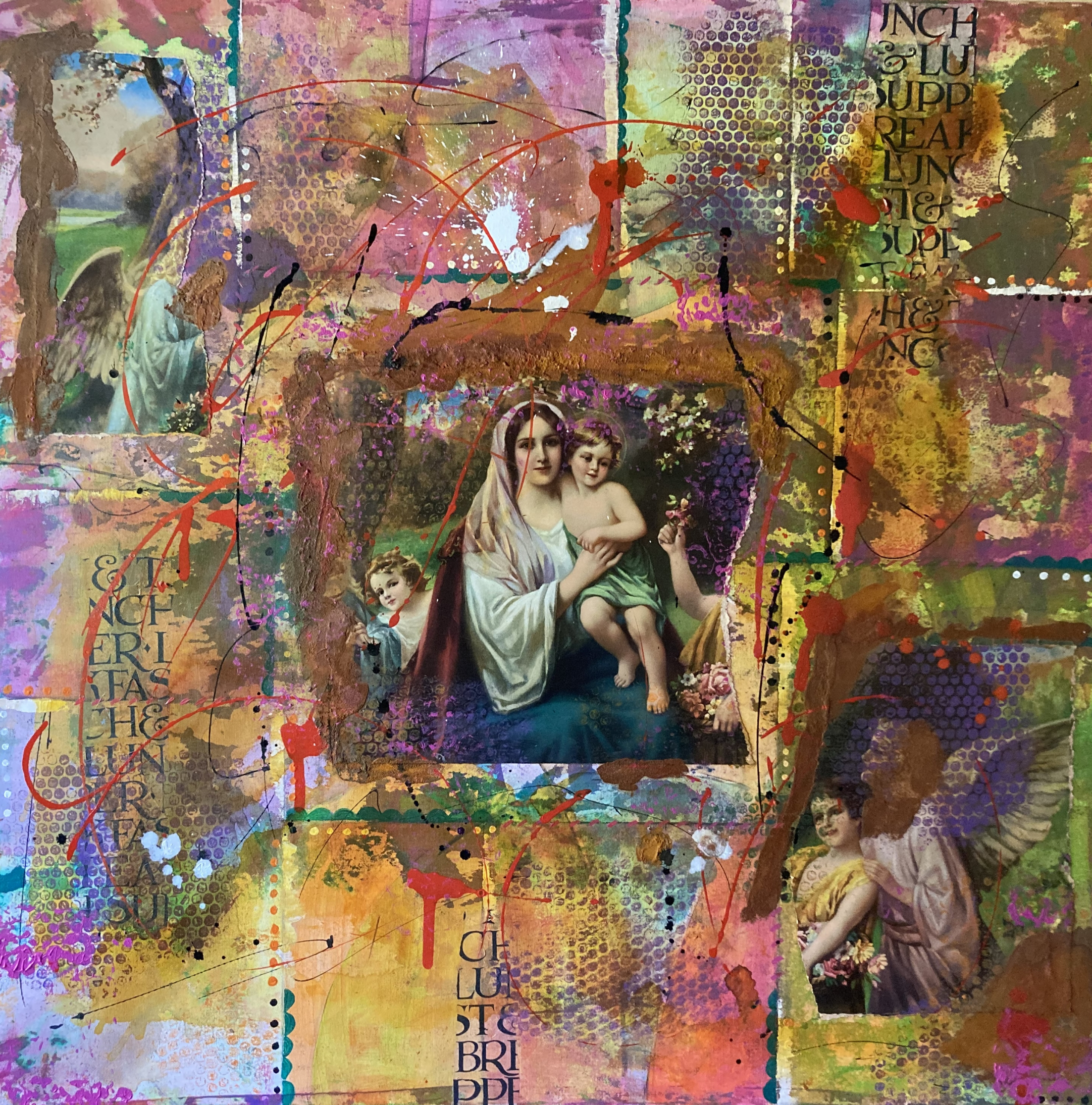 d'Familiä binänand, Collage und Acryl, 60 x 60
